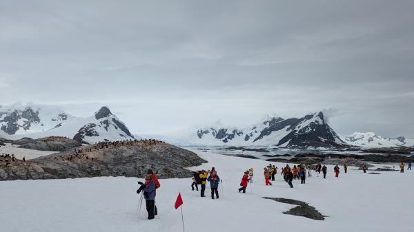 进入南极圈后的那天上午十点,我们乘冲锋舟踏上了南极圈内的土地,登陆了德塔耶岛 (Détaille Island)。这是南极圈内一座无人居住的岛屿,由法国探险家在20世纪初发现。登陆后我们在冰雪里行走。莽莽雪山,只有我们一队“探险者”,有那么点孤勇者的意思。其实,在南极大陆上登陆时,我们行走的路线都是船上的探险向导为我们提前探好的,雪地上插了小红旗,我们只能沿着红旗指引的道路前行,否则有危险。即使这样,我在雪山上行走时也摔了几次,雪里走路一深一浅,有时一脚伸到很深,人就摔下去了,使好大力气才爬起来。爬起来后首先的反应竟是“糟了,我这身衣裤触碰了南极大地,污染了。别笑,这是真实的经历。我们被反复告诫,在南极登陆时不可以坐在地上,以防交叉感染,破坏南极生态。上下船时我们都要消毒脚上的大靴子,遵守非常严格的环保操作规程。