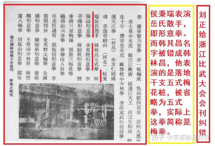 我在《李见宇师傅谈意拳49》一文中明确阐述:在意拳诞生的早期,“形意拳”却常常主动使用“意拳”作为拳名的简称。比如,著名武术家韩其昌,他是河北深州人。可是在1929年举办的杭州比武大会上,他登场表演的是形意拳,而自我介绍却是“意拳门”。这个韩其昌后来遇到尹谢章传授给他“落地干枝五式梅花桩”,又叫梅拳。《浙江游艺大会会刊1929》也特别说明韩其昌用形意拳进攻!和王芗斋的意拳无半毛钱关系!!!证据见如下: