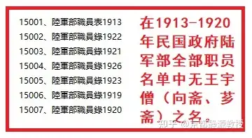 但是,按照当时惯例,吃皇粮的军官,一定在陆军部职员录中记录在案。而我查阅了全部保存至今的历年登记在册的《民国政府陆军部职员表》(每年厚达几百页篇幅)名单中,没有“王芗斋(含王宇僧、王向斋、王尼宝等)”之名。见如下: