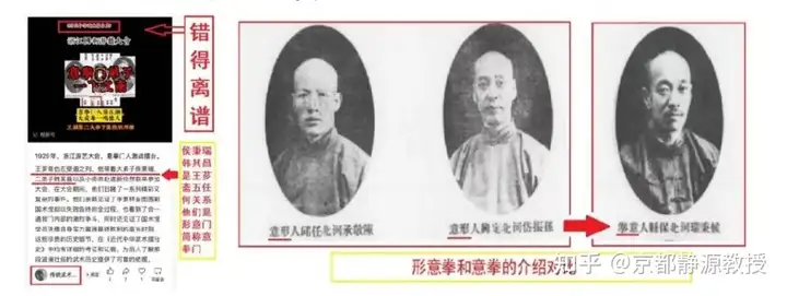 我们再看一本叫做《近代中华武术擂台史》的漏洞百出的烂书中,居然声称将韩其昌和侯秉瑞二人当成是意拳弟子和门人了,还被他人信以为真发到微信号(见下图左)上,形意拳和意拳的登记区别见下图右。如下: