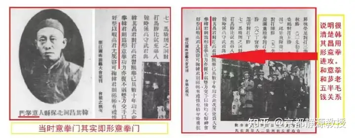 我们可以说:当时的比武大会主办方是很清楚“形意拳”和“意拳”的区别的,因为王芗斋就是现场裁判委员会成员之一。而在这本《近代中华武术擂台史》的烂书中,韩其昌和侯秉瑞都变成了王芗斋的弟子和意拳门人。