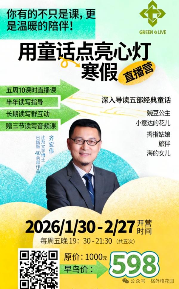 1、“用童话点亮心灯寒假直播营” 2026/1/30-2/27, 每周五晚上19:30-21:30