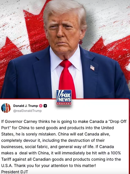 如果加拿大与中国达成协议,它将立即对进入美国的所有加拿大商品和产品征收100%的关税。感谢您对此事的关注!——DJT总裁