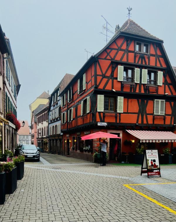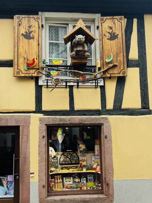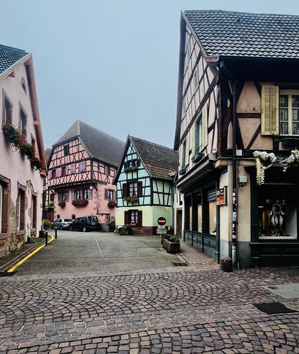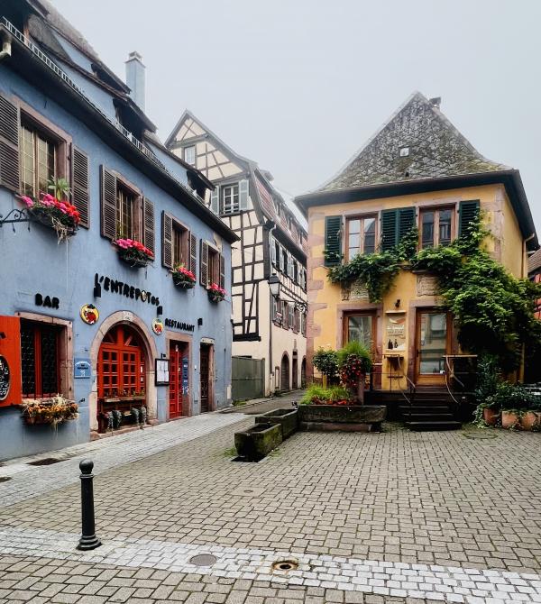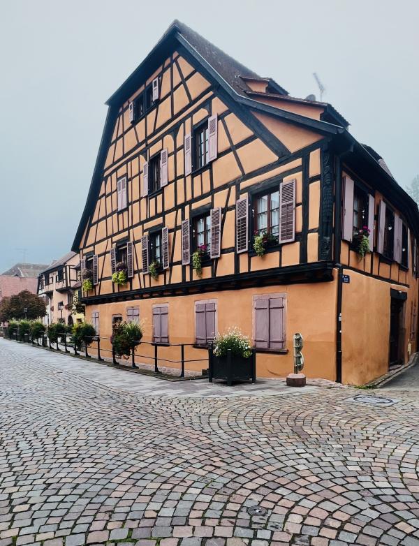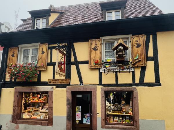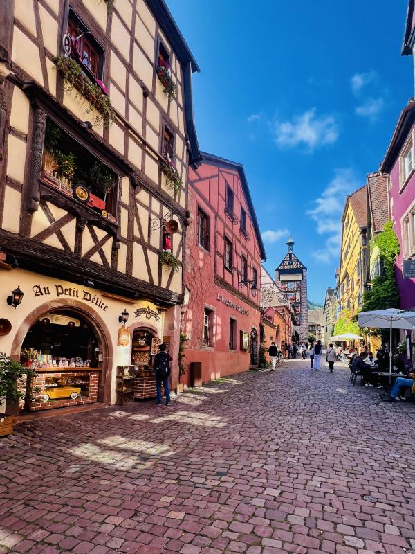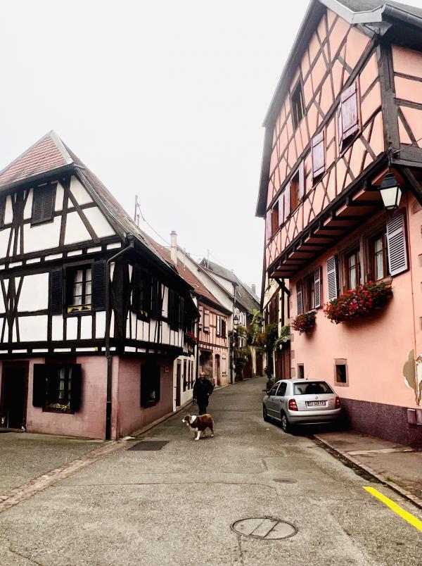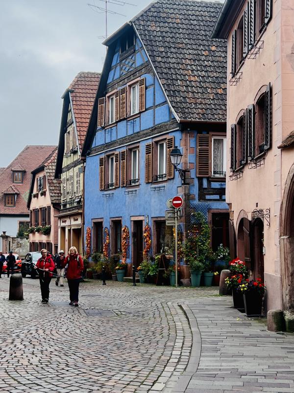 晨雾中走進寂靜的小鎮,我們是唯一的行人。小镇乾淨整潔的環境,色彩斑斕的建築,蜿蜒光亮的石板路??,简直就是夢幻般的童話世界。主街两边的店铺还没开张,但厨窗内的装饰精巧别致,非常有创意。一幢幢色彩绚丽多彩的房屋建筑,或明艳动人,或清新淡雅,就连门窗周围的装饰都可爱有趣,再次感嘆法國人的色彩美學与艺术修養,每一橦房屋建築的色彩搭配選擇都非常和諧、優雅,充满魅力。里博維萊的歷史悠久,于16世紀建成,但最早的初形可追溯到中世記初。这个市鎮面积仅約32平方公里, 人口數量為4700多人的小镇,不仅酒吧餐廳商舖林立,更有眾多的酒莊可以品酒,其童話般的美麗浪漫迷人程度不遜於科爾瑪。但游客少很多,少了擁擠與喧鬧,逛起來非常舒適愜意。而小鎮外圍则是漫山遍野的葡萄園,山頂上屹立著古堡,景色迷人。稍晚见到成群结队的中老年登山者,身背背包,手持登山杖从山路上走下来,来到镇上的咖啡酒吧休息小酌。遗憾的是我们没有时间去山上的城堡,只能望景兴叹。