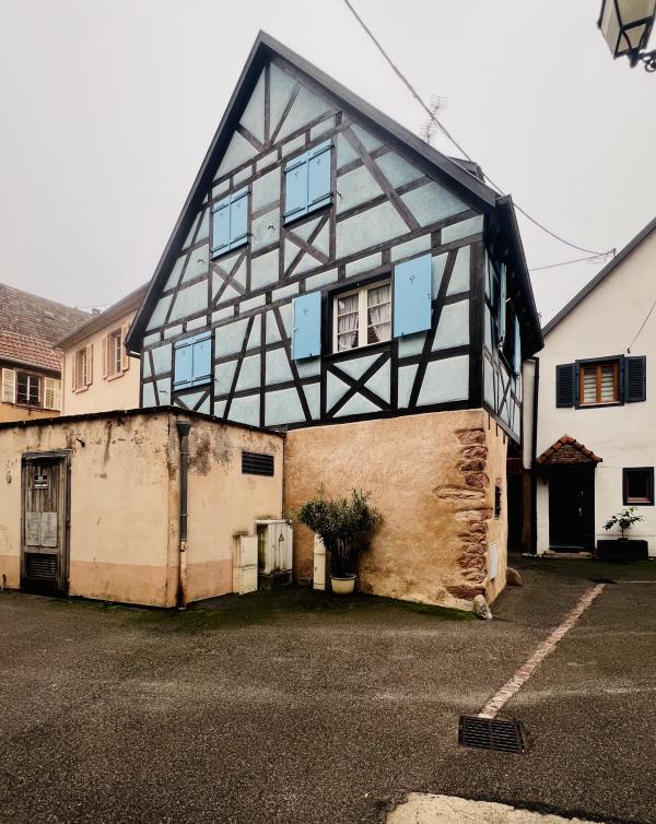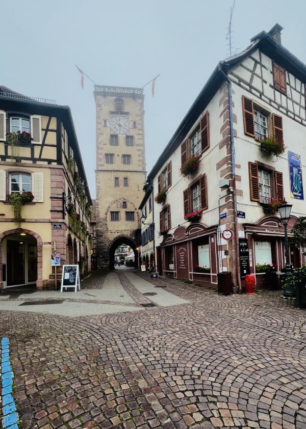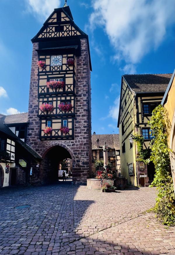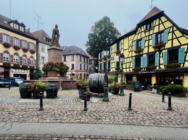 里博维莱与里屈埃维?是两个同属阿爾薩斯葡萄酒鄉的童話小鎮,在科尔玛偏北的同一条巴士线上,里博维莱远一些,约50多分钟的车程。我们决定由远而近,先是一站到底。一早便从科爾馬撘乘Bus前往里博維萊,晨光中的法国乡村公路车辆不多,景色秀美。大約50分鐘左右,还不到9点钟,我们便抵达了里博維萊,巴士站就在老城区入口附近的街心广场,非常便利。