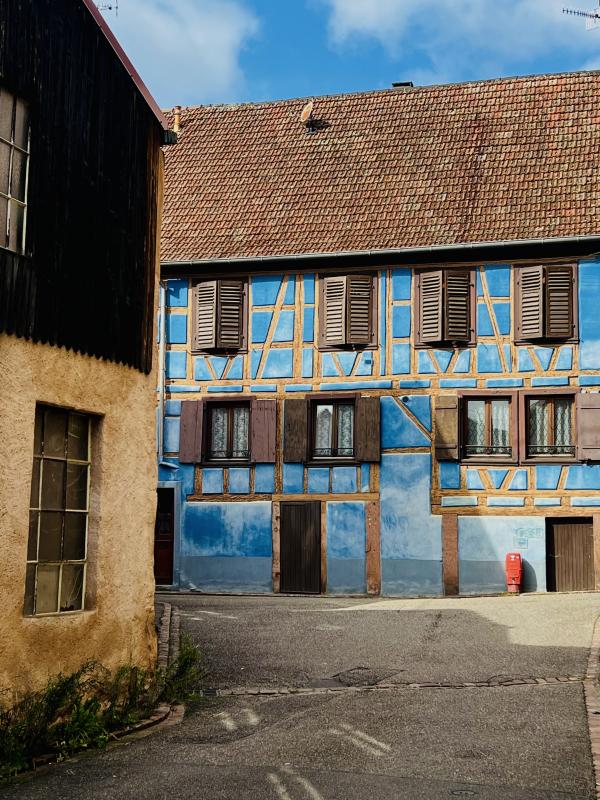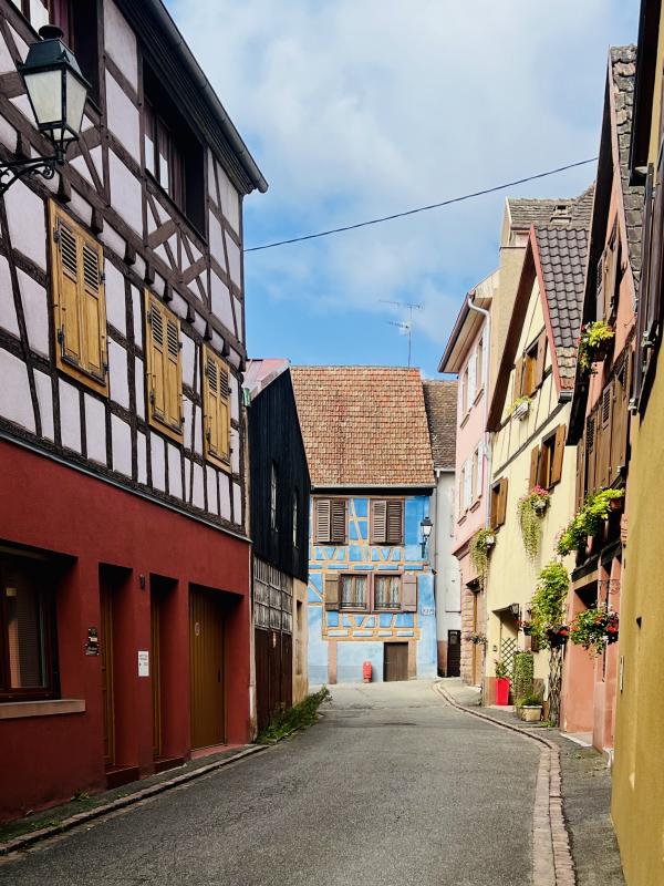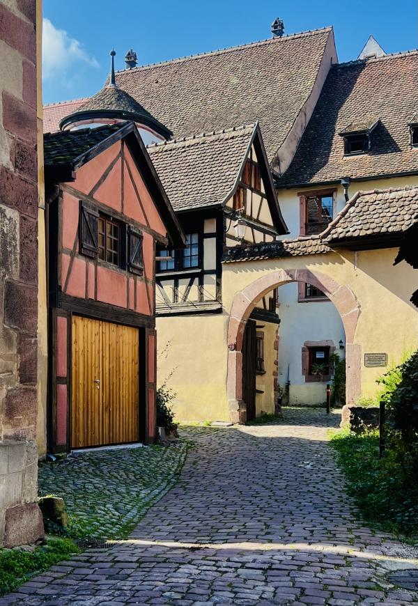 午后再撘Bus 來到里屈埃維,里屈埃維 Riquewihr也有譯成里克維爾的。這同样是一個被葡萄園環繞的小鎮,據說這里出產的雷司令非常有名。里屈埃維也是法國最美鄉村之一,充滿童話般的美麗氣息。午后的阳光明媚,碧空如洗,主街上已是游人如织。街边的酒吧歺厅几乎坐满了品酒小酌的人们,人声鼎沸,看上去很是惬意和享受。转去主街的侧后巷,又是一番景象,古樸靜謐的小巷,色彩繽紛的小屋,蜿蜒曲折的石板路,几乎游人全无。酒坊的后院可见堆叠着大大的木酒桶,空氣中瀰漫著濃濃的酒香??,令人心醉痴迷。被譽為法國最美小鎮,里屈埃維名符其實!