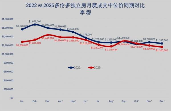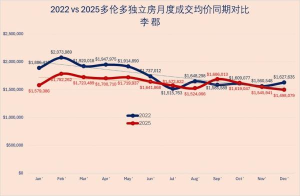 2022 vs 2025 多伦多独立房月度成交价格同期对比