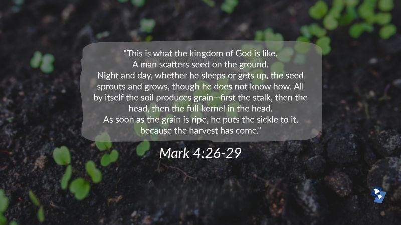 马可福音4:26-29—— 26又说:“神的国,如同人把种撒在地上。27黑夜睡觉,白日起来,这种就发芽渐长,那人却不晓得如何这样。28地生五谷是出于自然的:先发苗,后长穗,再后穗上结成饱满的子粒。29谷既熟了,就用镰刀去割,因为收成的时候到了。”