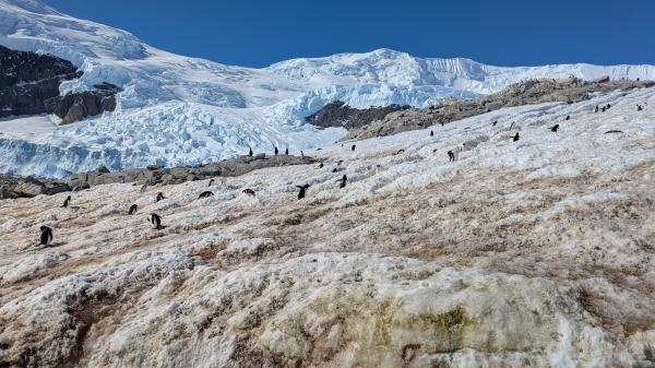 企鹅上下山的 “highway”。褐色的雪是被企鹅粑粑(很臭)染成那颜色的。