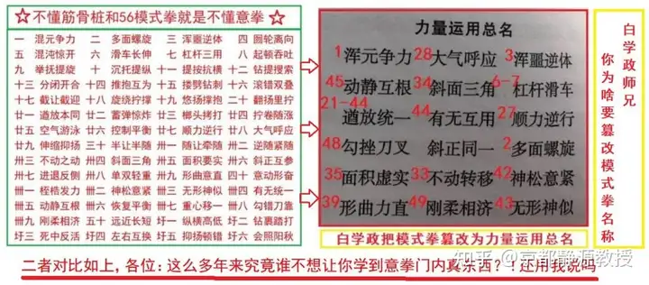 我们大家看到“力量运用总名”这里边第一个叫“混元争力”,就是56模式拳的第一拳“混元争力”;“力量运用总名”第二个叫“大气呼应”,就是56模式拳的第28拳“大气呼应”;“力量运用总名”的第三个叫“浑噩逆体”,就是56模式拳的第三拳“浑噩逆体”。以下省略。我全部都一一标注了“力量运用总名”的四十四个名字和56模式拳的对比,证明“力量运用总名”修改乃至于篡改了56模式拳的原始名称和来历。二者对比如上,各位:这么多年来究竟谁不想让你学到意拳门内真东西?!还用我说吗。你还相信“姚宗勋先生生前的著作及文稿和信件中从未出现过所谓‘56模式拳’字样”?你还相信“实际情况似乎是‘56模式拳’王芗斋只秘传给了李见宇李见宇只单传给了刘正教授”?你还相信“姚先生生前是否知道‘56模式拳’以及姚先生是否与‘56模式拳’有任何关联,承光承荣二位先生最有发言权。并且二位都健在,至少到目前为止二位先生文章、教材及教学中未提过所谓‘56模式拳’”?