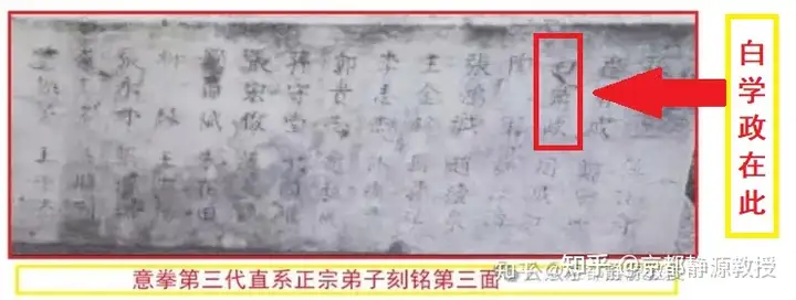 56模式拳每一拳都有具体的练法和动作要领。但是你白学政却称之为“力量运用总名”,你把这些真货给他妈的虚化、名词化、形容词化,你到底是何居心?我代表所有被你欺骗的读者们先给你三个排比句!我这里还想请这个白学政师兄解释一下,什么叫做“力量运用总名”?你为什么要把祖师爷的56模式拳修改成四十几个“力量运用总名”?难道每个名称背后不是被你们隐瞒了咱们祖师爷创立意拳的门内真货吗?这个白学政的名字出现在祖师爷墓碑上第三代排名中,论起来,属于我师兄级别的。见如下: