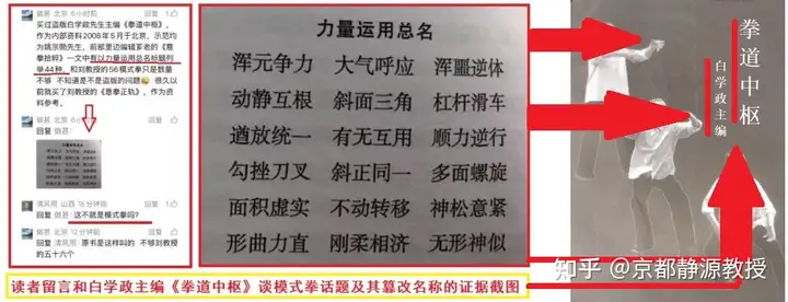 我和白学政这位师兄至今没见过面,我们之间绝对属于往日无怨、近日无仇。我们分别属于平行宇宙,两不相干。如果不是读者留言告诉我白学政居然斗胆篡改了56模式拳为“力量运用总名”,那他对我来说就是路人甲、路人乙而已。就事论事,既然你知道或者学过了56模式拳,你却在公开出版的书中篡改名称为“力量运用总名”,总该有个不可告人的目的存在,愿闻其详。