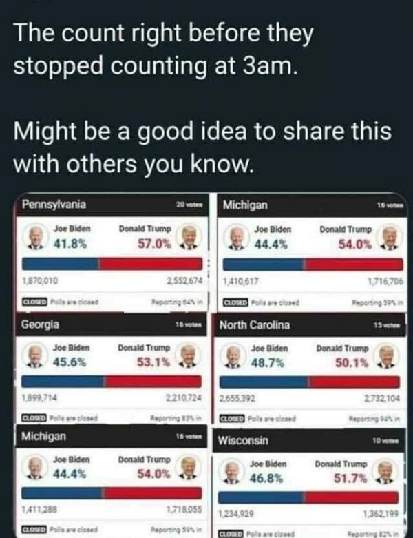 拜登不可能在2020年赢得佐治亚州!富尔顿县选举官员表示,州立农场竞技场的水管破裂了。如果那是真的,如果不是,竞技场会在几分钟内被淹没。这是亚特兰大老鹰队打球的地方,这个设施的水管尺寸至少是8英寸直径的管道。富尔顿县水务部门没有接到电话,这是一个巨大的危险信号,亚特兰大的任何新闻频道也没有报道。那是一个漏水的马桶。然后是选举官员从桌子下面拿出行李箱的视频。只是好奇的是,拜登的选票总数在这些事件后飙升。