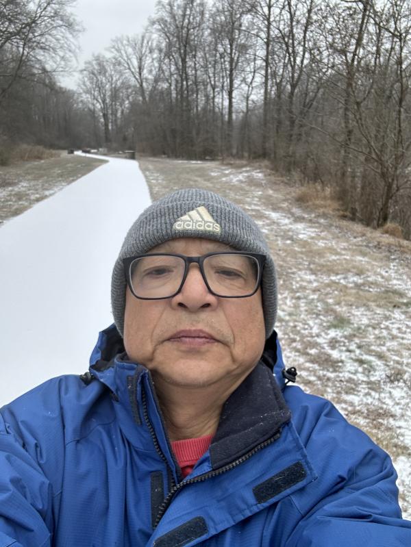 走到休息点。一位来自菲律宾的朋友为我拍照。他说,夏洛特去年的雪比这大。我说,我来自芝加哥。