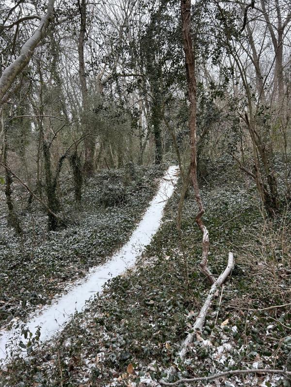 往日周末,这里有人在山间骑自行车,此时,连一道车痕也没有。我虽留下自己的脚印,但明日也会消失。不变的是空净,清冷,孤寂。还有,那顽强的生命里,在大树赤裸的身体内,一树冬青,硕果累累。雪白,只在小路上留下清晰痕迹。