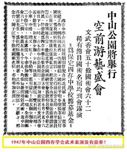 我很奇怪为什么很多意拳名家和粉丝们总相信著名的银行家和社会名人手里大把的银子不去嫖娼、置妾和投资非要资助王芗斋的意拳事业?就连王芗斋和意拳的大恩人四存学会,在1947年中山公园举办的北京市春节武术表演活动中,都彻底和王芗斋及其意拳划清了界限!因为四存学会董事长张璧当时深陷囹圄,正面临着汉奸罪的指控,好在最后没有定罪成功。但是四存学会董事会却是人走茶凉,立刻更换了新的董事长,而武术教学班也换上了新的导师:富杰臣、王维才、邢金台和陈子江等人——意拳不再是四存学会的主打推广项目,于是王芗斋及其弟子们被全体扫地出门!证据见1947年2月9日原始报道: