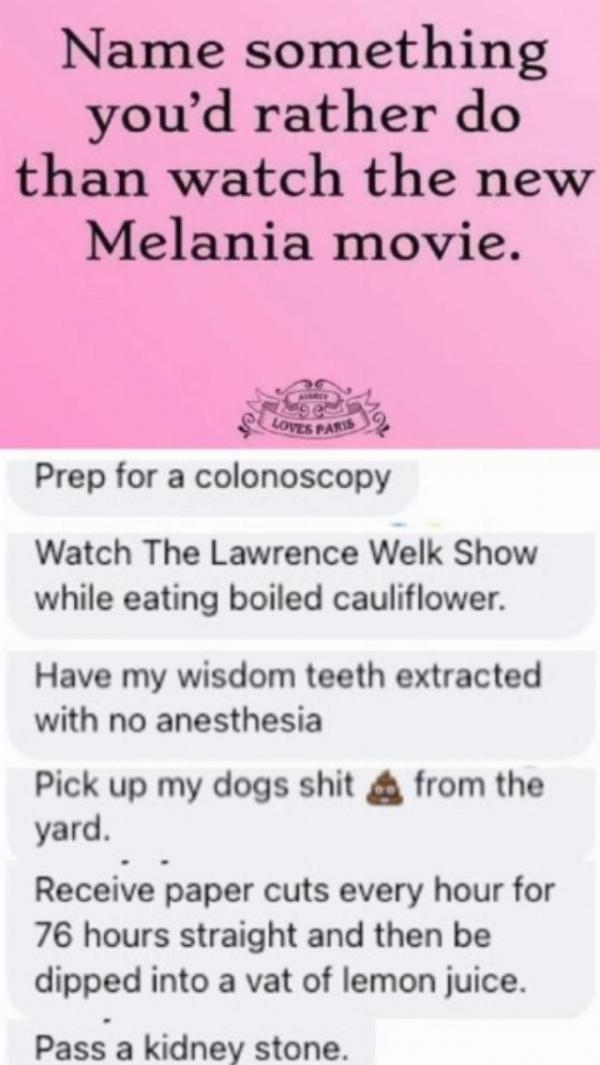 有一些观众看到那些不枯燥、清醒、不讲道和彻头徹尾的可怕事物(我在想最新的《星际迷航》参赛者)。 我们只能希望更多的电影制作人会吸引这些观众。 很高兴看到Melania因是一位完美的第一夫人而得到应有的赞赏。