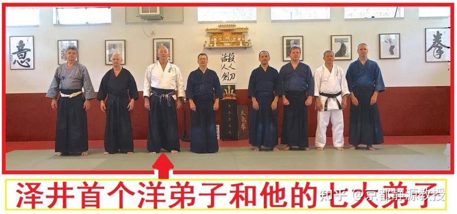那么我们看看上面这张照片右,就是晚年的简在自家武馆的留影。你可以看到他武馆装饰全部是对他的老师泽井健一的深切怀念,唯一能够让你看出来中国元素的只剩下“意拳”二字。甚至连墙上悬挂的装饰品居然也是日本神社的模型,他在努力证明他传播的是日本拳法太气拳,而不是中国意拳。大家看看下面这张照片,就是简(左起第三)和他的七个大弟子们的集体合影,他们是整个荷兰太气拳界的八大顶尖高手,代表了整个荷兰、也是欧洲的太气拳(日本意拳)的一个中坚力量,他跟乔治·查尔斯在法国的形意拳和意拳传播体系形成了两个对立的联盟体系。