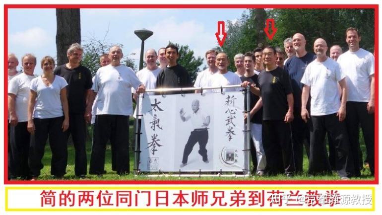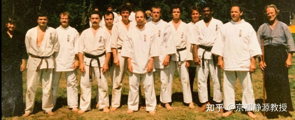 所以当我们看到简在整个荷兰(从室内道场到室外树林)铺满全国的荷兰太气拳(日本意拳)宣传活动时,证明了他传授的太气拳已经逐渐演变成不东不西的一种新式拳法。我听说泽井健一的弟子们对此也很不满意,因为他已经改动了很多。但是简的荷兰太气拳(日本意拳)虽然和日本意拳有一定区别,而跟中国意拳的区别却更大更多!我看泽井健一及其弟子们的日本意拳视频,无论是站桩、试力还是推手,还能看出中国风格——两者最大的区别在实作,即断手。但是看简的意拳,中国的风格就越来越少了,更多的是日本风格了。你看下面这张照片第一个感觉他们是练意拳的吗?肯定不会!百分之九十九都认为他们是练空手道的。实际上,这是简的某次太气拳高级进修班的成员合影。