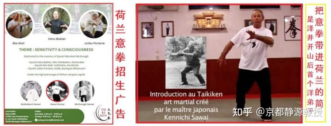 泽井健一的第一个欧洲弟子简,学成后他回到荷兰,在整个荷兰建立起了全国范围的太气拳(日本意拳)推广基地,而他推广的却是自己的恩师泽井健一的日本太气拳,也就是日本意拳。大家看到在他的网站上祖师爷就是泽井健一,已经没有了咱们祖师爷王芗斋的位置和照片存在——至少在日本的太气拳网站上还有王芗斋的照片,但是现在在简传播下的荷兰意拳官网上,大家只知道这个拳法是日本拳法、创始人是日本拳圣泽井建一,而且他把这个拳从锻炼风格到比赛规则越来越向日本的空手道靠拢。见下面照片左。