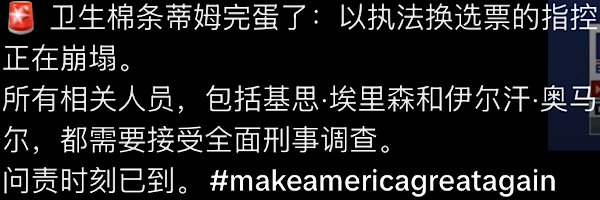 我们的主权将会收复。我们的安全将会恢复。司法的天平将重新平衡。司法部和我们政府被恶意、暴力且不公正地武器化的现象将结束。