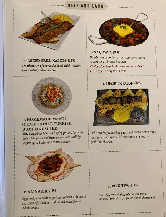 菜名叫不上,好在有图片。我们就按着图片点,叫了一个烤面饼,一个瓦罐羊肉,一杯土耳其酸奶和土耳其咖啡。