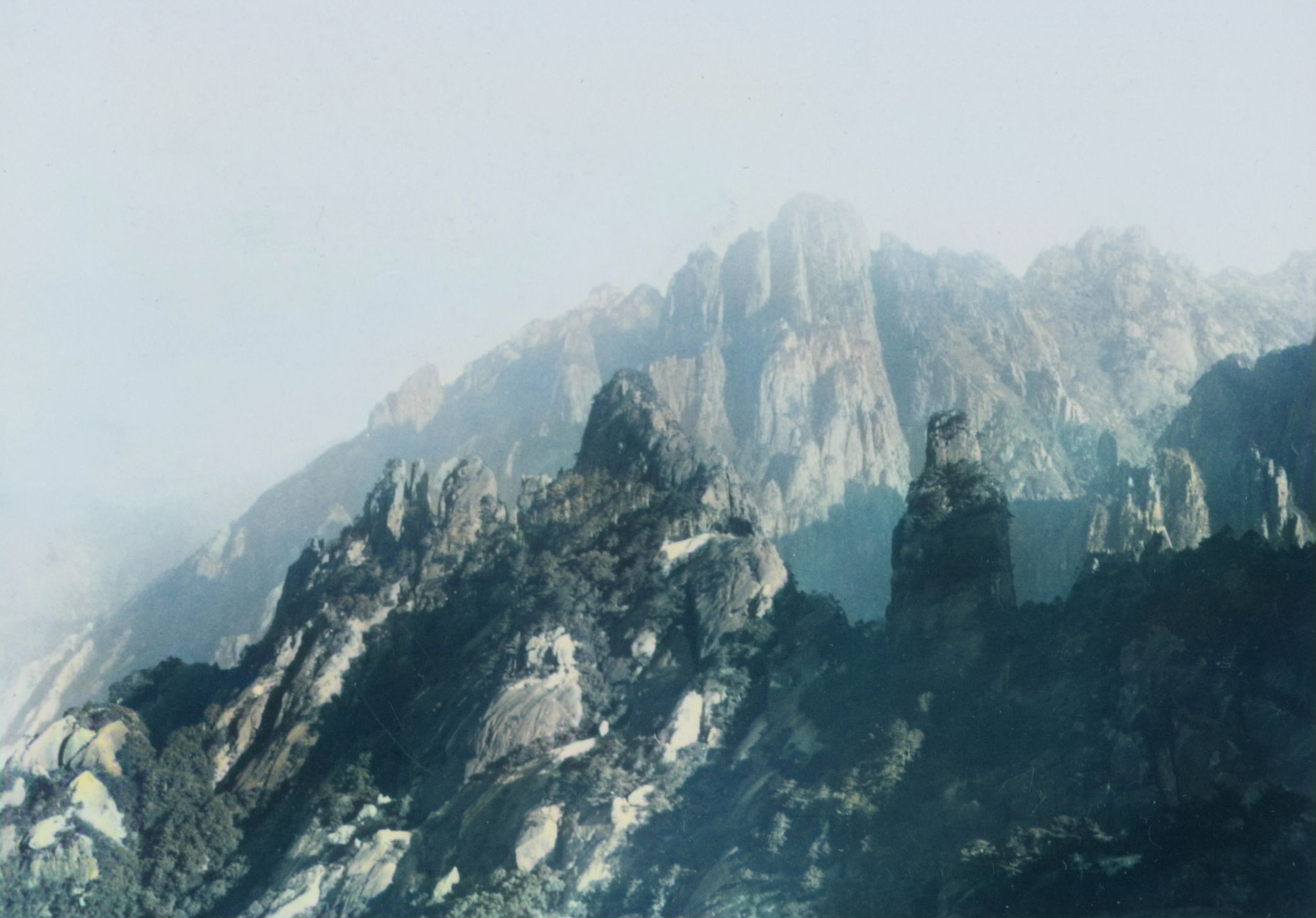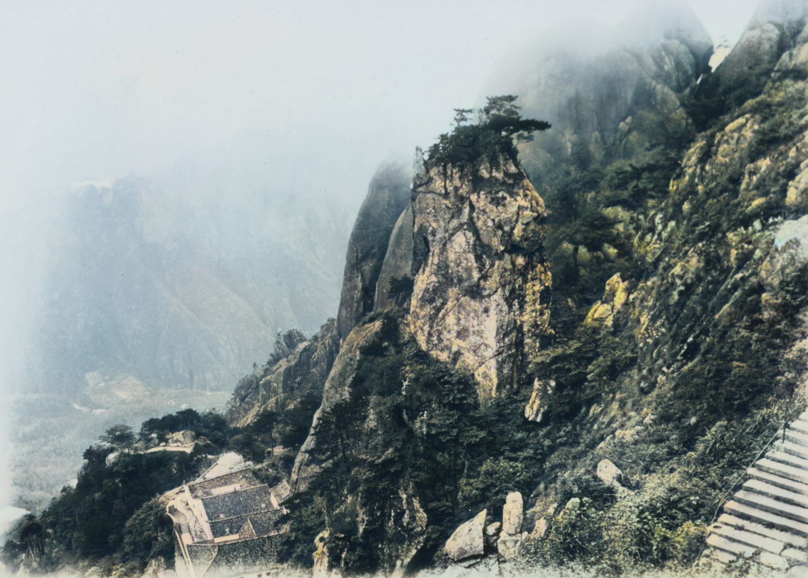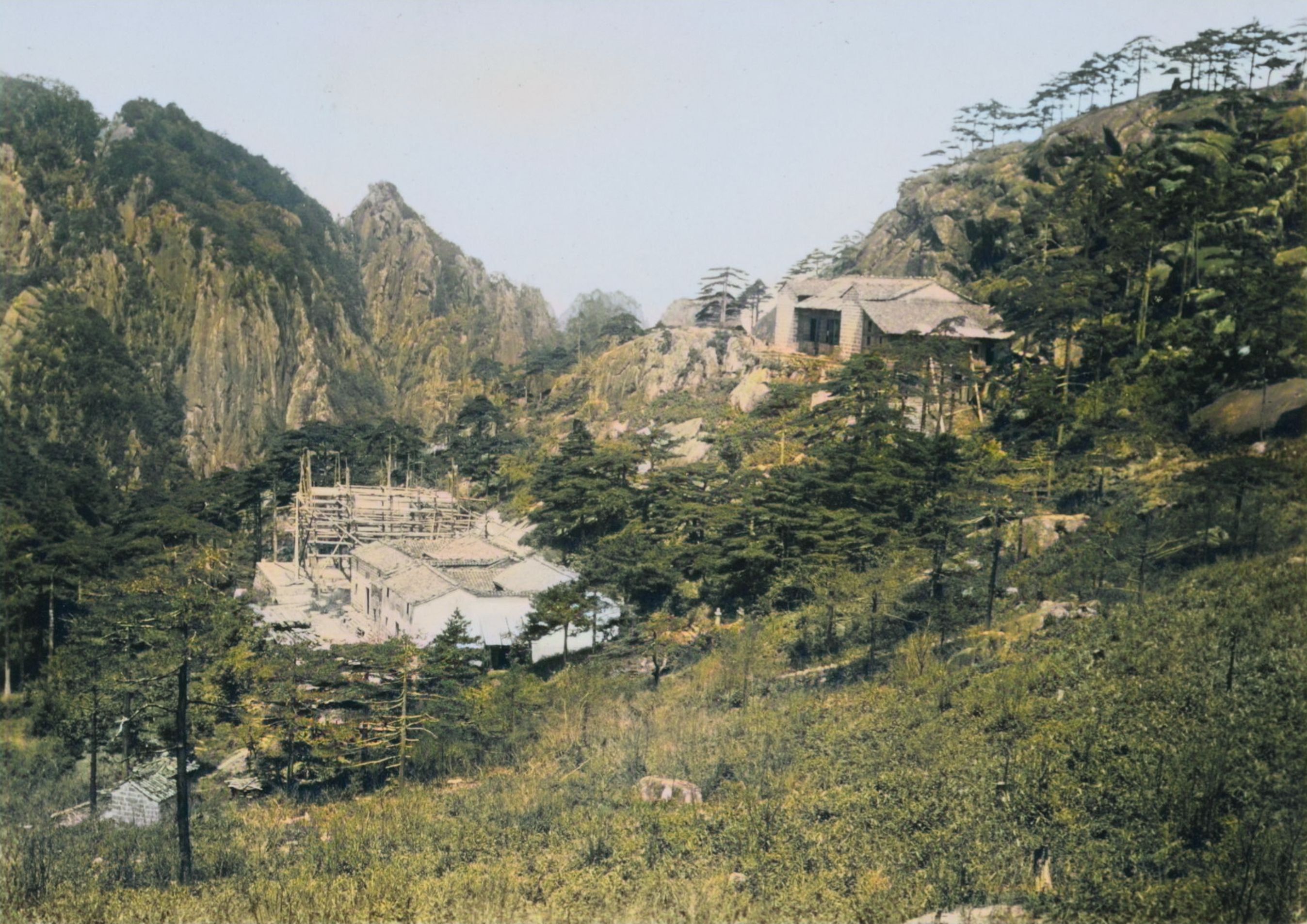 黄山群峰耸立,四仙峰层峦叠嶂,蔚为壮观。照片中的建筑是狮子林禅院,最初由五台山僧一乘于明代万历年间在此清修,后于清康熙二十年(1681年)扩建为观音庵。