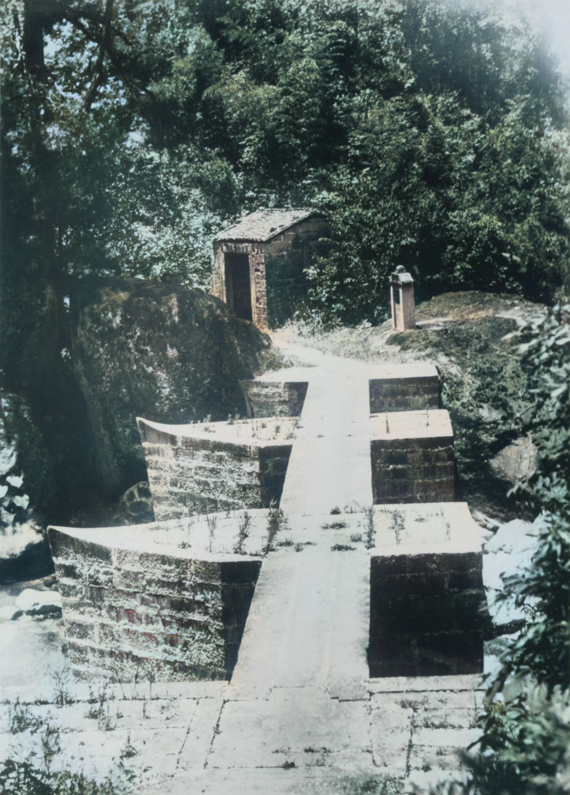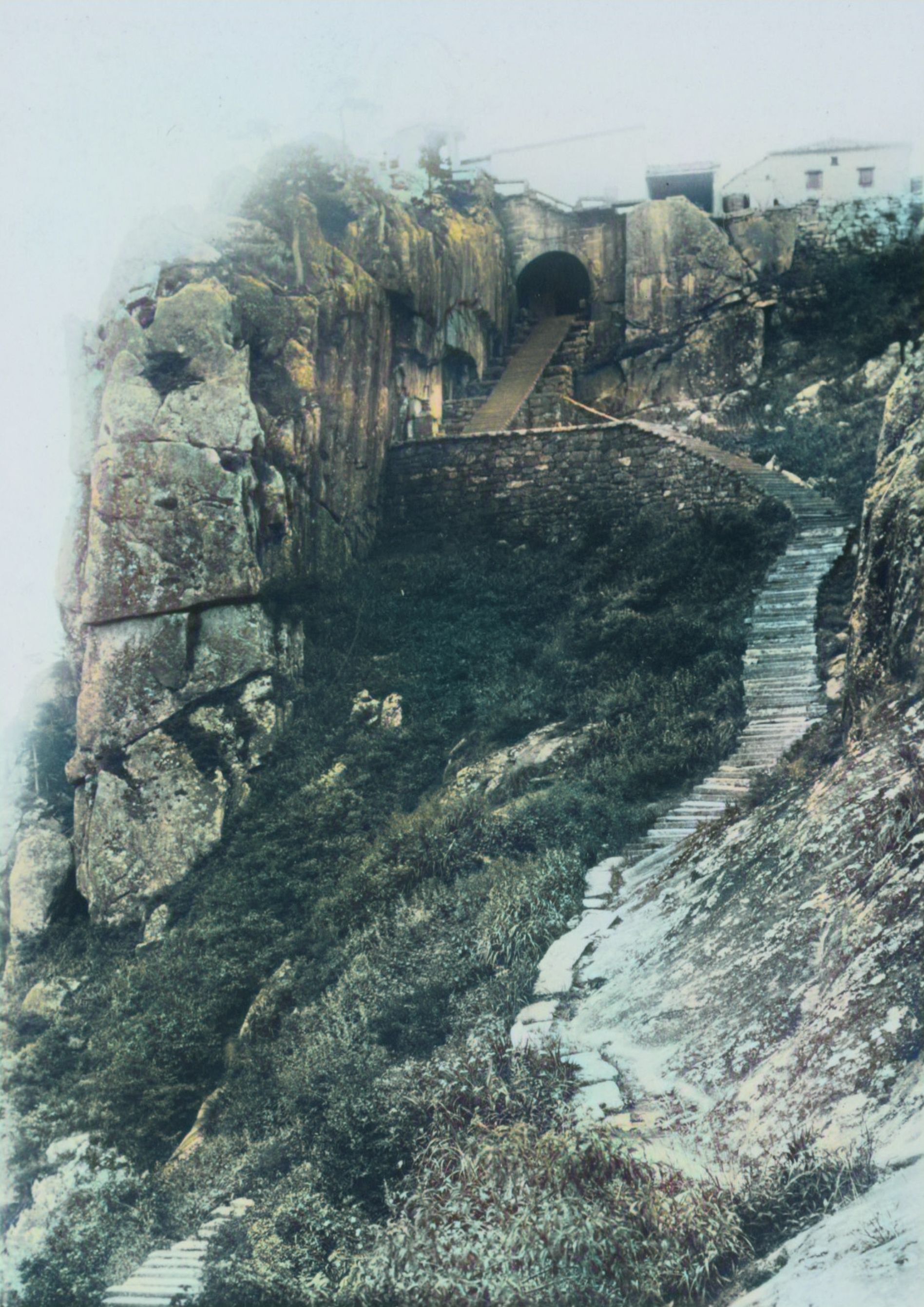 登天台峰的山路,侧前下方的寺庙为古拜经台。