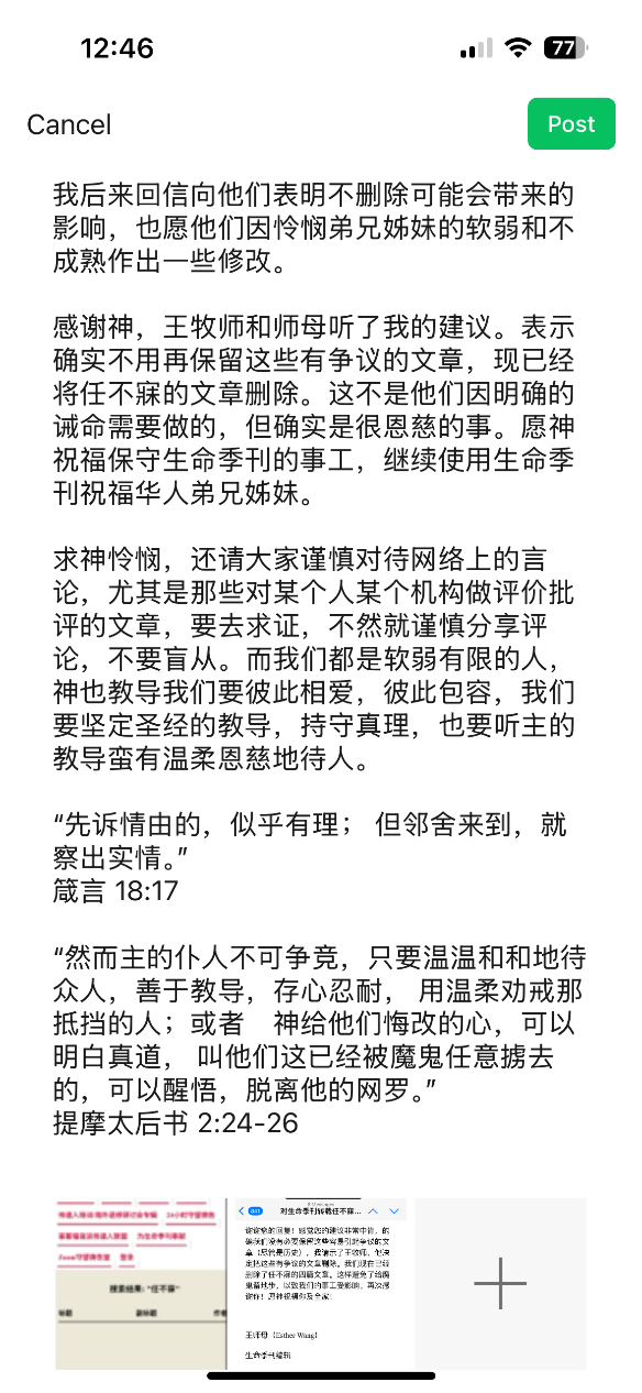 在这种情况下,我回应Abigail的来信时写了下面的话。这段文字我曾允许Abigail分享给其他同样有困惑的弟兄姊妹,所以Abigail曾私下分享给了一个向她询问季刊为何不回应青草的微信群友,又被那个群友转发到青草建立的微信群中了。就是这段文字,被陈鸽牧师和小草在全网公开的文章中定为“毁谤陈鸽”: