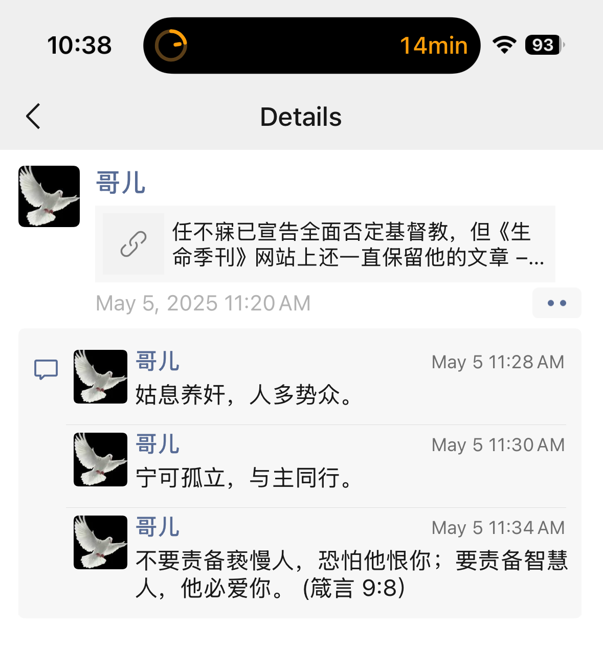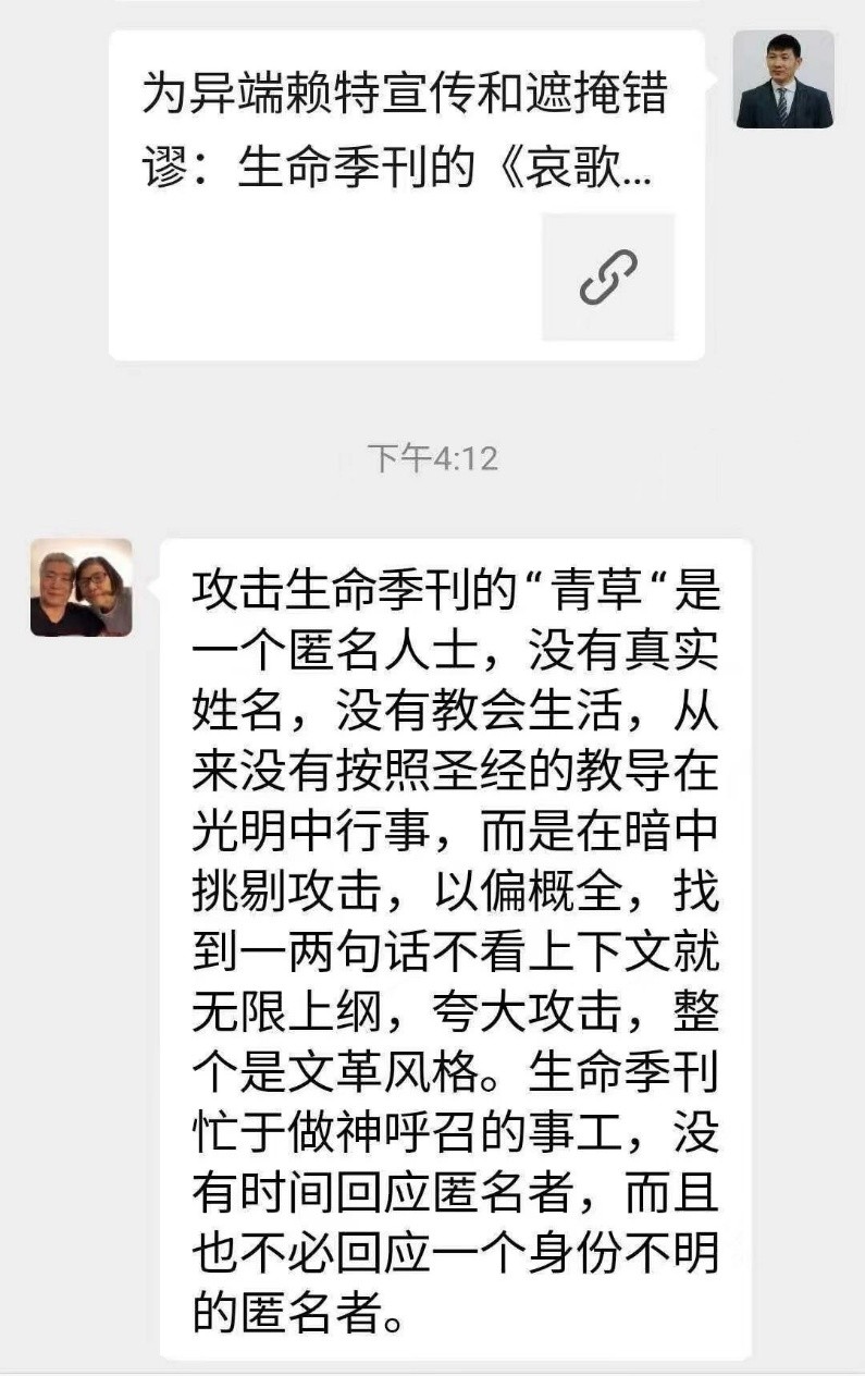 这是一位网友发来的截图。截图中的“哥儿”就是陈鸽牧师,他先发了一个小草文章的链接,这篇文章就是“任不寐已宣告全面否定基督教,但生命季刊网站上还一直保留他的文章”,在此文中小草说: