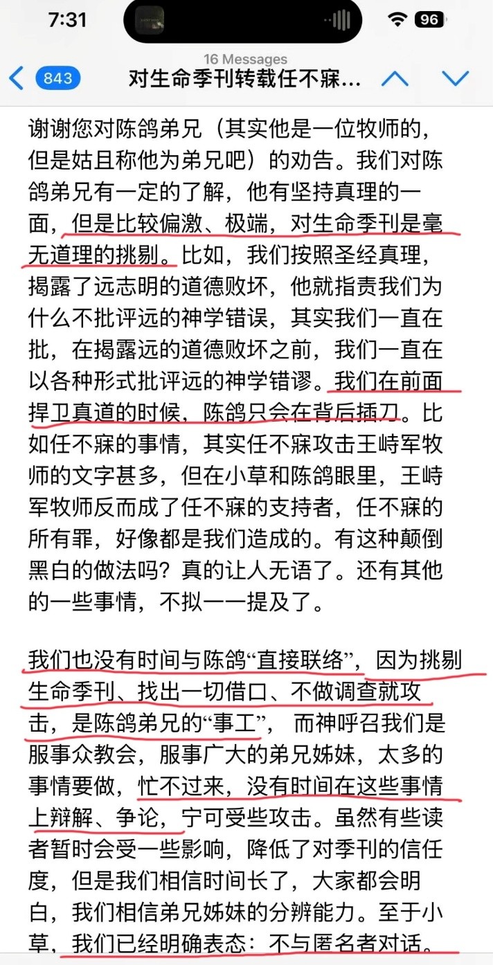 我已经在给Abigail姊妹的信中说明了关于生命季刊与任不寐的关系的真相,在此不再重复。而陈鸽牧师是先转发这篇内容不实的文章,然后他在下面发出了这样的评论:姑息养奸,人多势众。