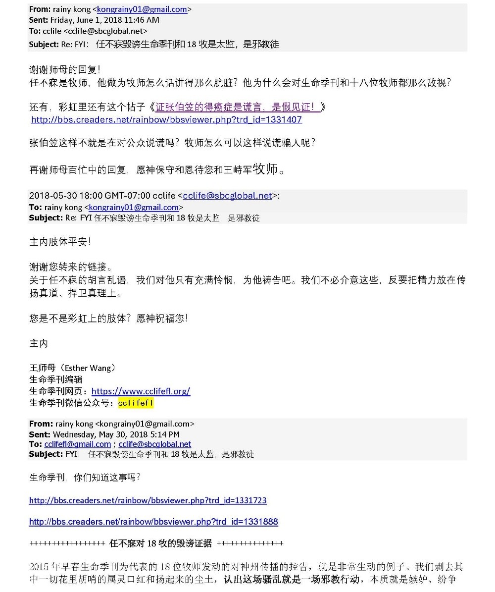 我的回复证明,我并不知道她是谁,她的确是以匿名发的这个电邮。接下来的回复令我非常感动: 2018年6月1日上午 11:46 AM,小草的回复: 谢谢师母的回复! 任不寐是牧师,他做为牧师怎么话讲得那么肮脏?他为什么会对生命季刊和十八位牧师都那么敌视? 还有,彩虹里还有这个帖子《证张伯笠的得癌症是谎言,是假见证!》 http://bbs.creaders.net/rainbow/bbsviewer.php?trd_id=1331407 张伯笠这样不就是在对公众说谎吗?牧师怎么可以这样说谎骗人呢? 再谢师母百忙中的回复,愿神保守和恩待您和王峙军牧师。