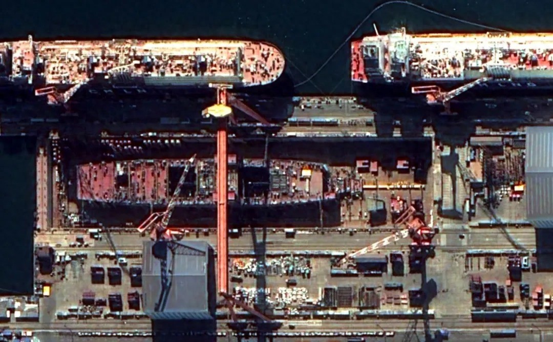 更值得注意的是建造速度。对比之下,美国“企业号”(CVN-80)虽然早在2017年便已开工,但直到现在仍未完成完整水线合拢;而中国第四艘航空母舰自明确入坞至今不过一年左右,水线主体却已接近完成。工业能力的差距,并不需要过多修辞,只需将两组卫星图放在一起,答案便已写在画面里。