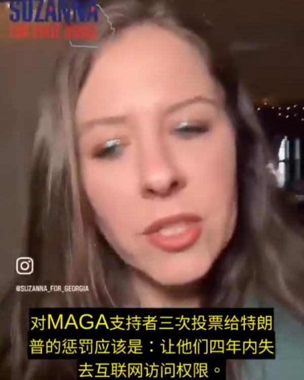 佐治亚州民主党州众议院候选人Suzanna Karatassos在一则现已删除的视频中公开表示,一旦特朗普下台,MAGA支持者“需要失去互联网访问权四年”作为投票支持特朗普的惩罚。