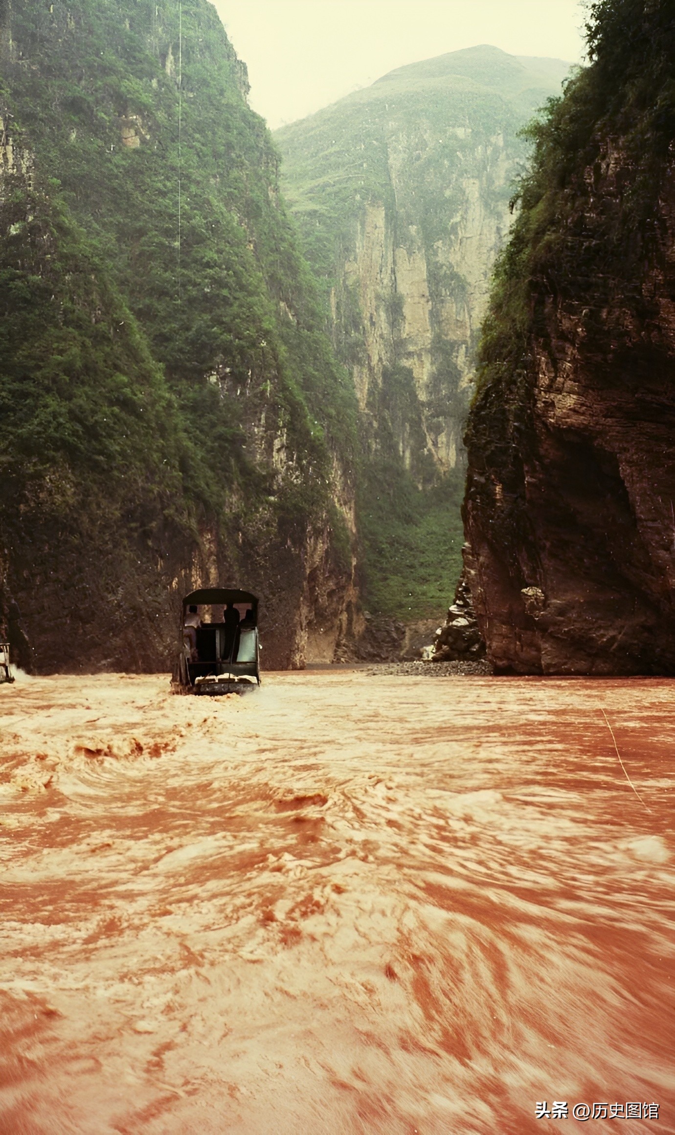 90年代,“长航江山号”游轮正在驶过夔门。壮观的峡江风貌,给船上的游客留下了深刻印象。船上打出的条幅上写着:舍小家,为国家,支援三峡工程建设!