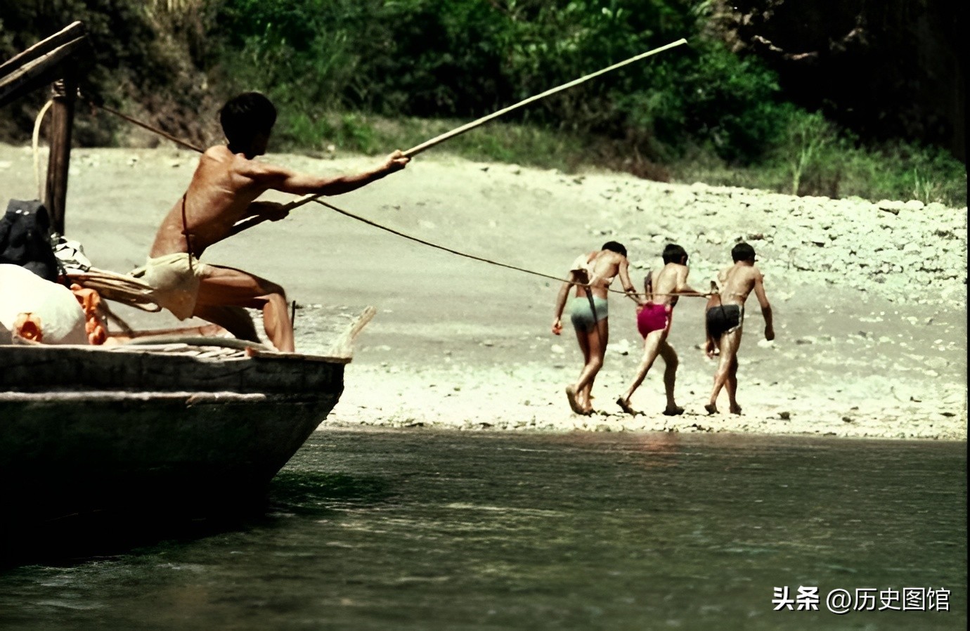 秭归新滩南岸,光着脊梁的纤夫拉着沉重的货船逆流而上。船工也在奋力撑篙。随着大坝蓄水,三峡纤夫这个职业逐渐从人们的视野中消失了。
