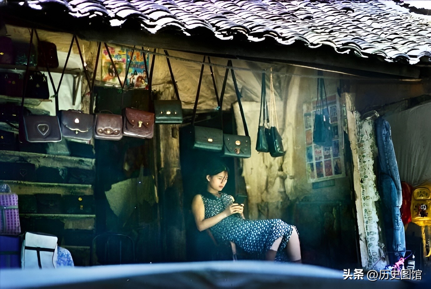 在街边一家卖包的小店门口,一名女足坐在椅子上。她手里拿的不是手机,而是那个年代最流行的俄罗斯方块。