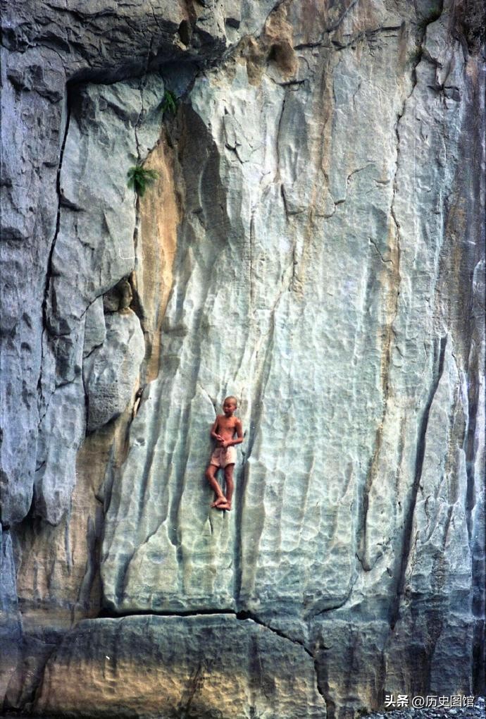 当时的三峡还没有蓄水,一个十几岁的孩子,身手敏捷地爬上江边的峭壁。摄影师抓拍下了这一瞬间。不久之后,这里也将沉入水底。
