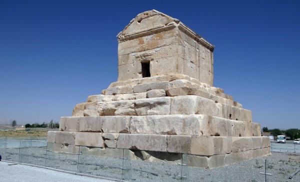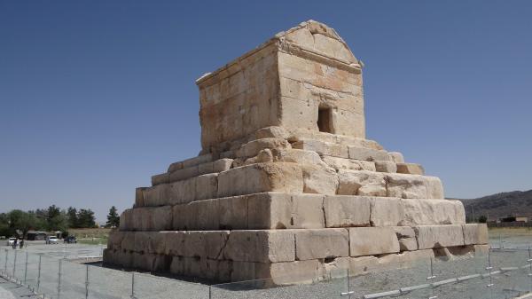 居鲁士的坟墓由巨大的石块砌成六级台阶金字塔形基座、顶部是简单的石屋墓室极其朴素,没有华丽装饰。其规模远远不能与后来的秦始皇的皇陵相比。但是,我们春秋战国时期的王陵恐怕一座都没留下了。更让人惊讶的是,现场还有约近五十多根残缺的排列的石柱,直径1.2米,估计原高约15米,总数有46根。这些地方原本是居鲁士的居住宫殿。在2600年前这是非常惊人的工程规模。我国历史上从来没有这样规模的石柱,直到上世纪50年代,在北京人民大会堂外建立了十根石柱,每根直径约2 m、高25 m。然而是内部钢筋混凝土结构,外部用石材包裹的。