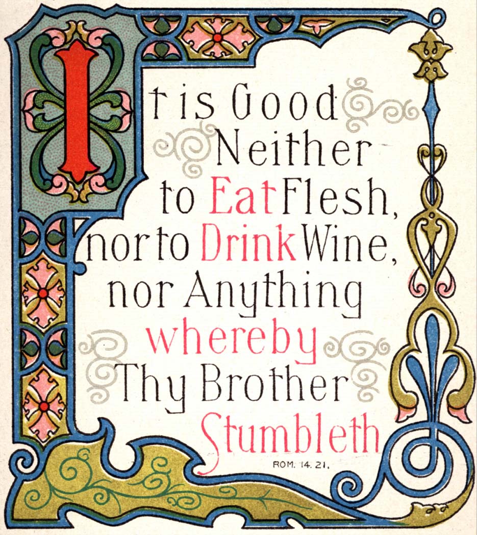 在吃喝的时候,你的亲友会让你抽烟、喝酒。一般基督徒的回答是:抽烟我们要抵制,喝酒不是罪,我们少喝一点也无妨。但是我要诚恳地劝弟兄姊妹:为了避免软弱的人因我们的缘故跌倒,我们就不要喝酒,使徒保罗说过,“无论是吃肉,是喝酒,是什么别的事,叫弟兄跌倒,一概不做才好。”(罗马书14:21)