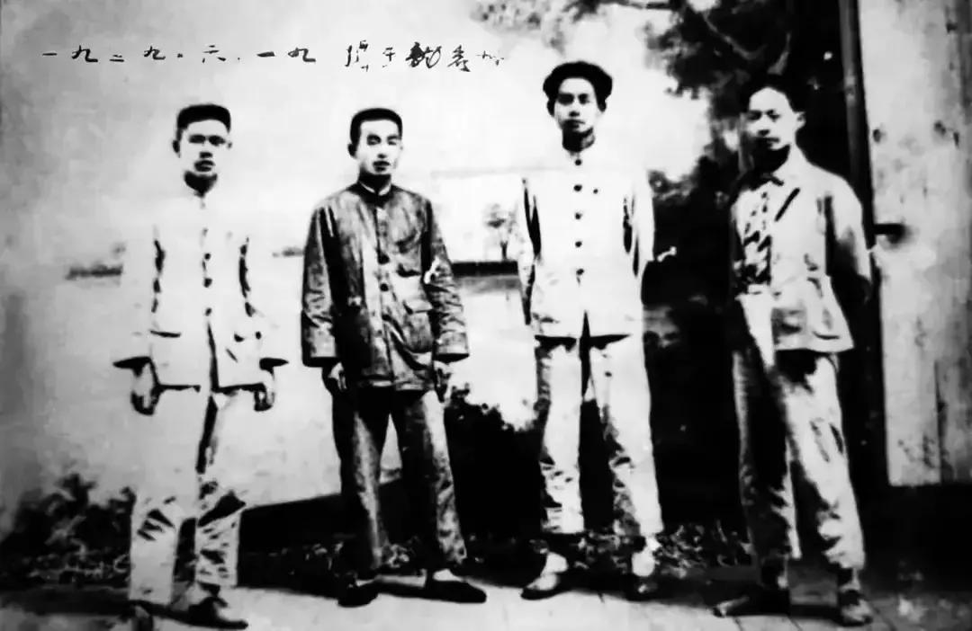 1929年6月19日,龙岩城,这张照片80年后才被发现,右起:陈毅、毛泽东、谭政、朱良才
