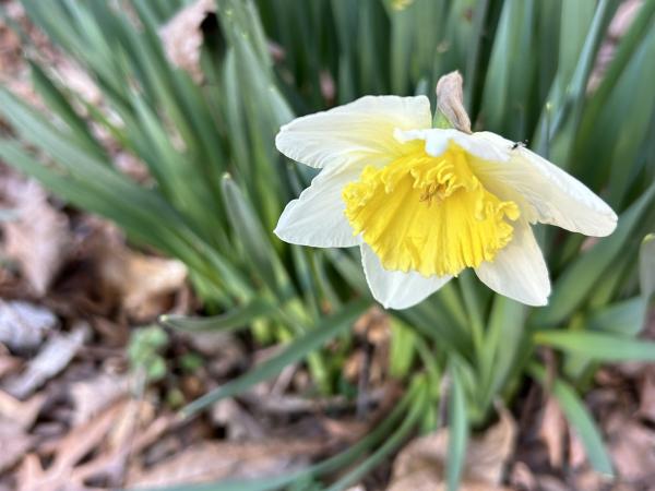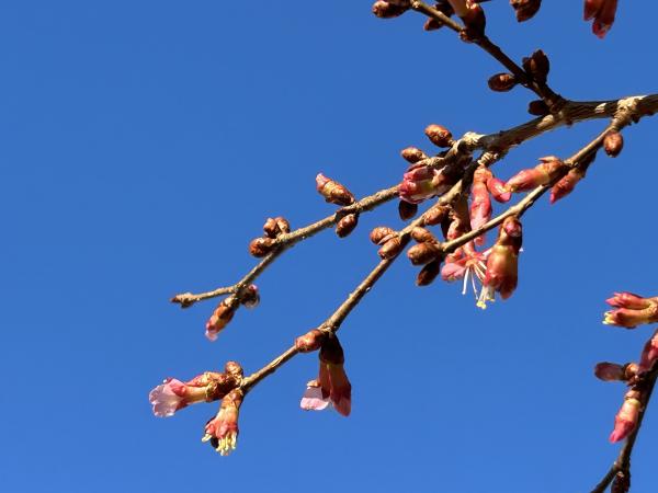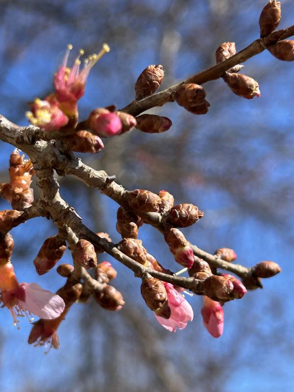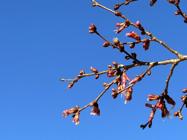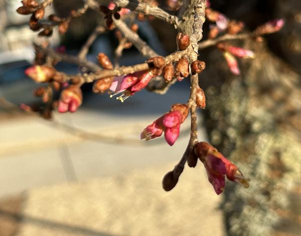 二月是复活的季节,万象更新。复活的信息写在初放的小花上,仙女号角点点粉红;蒲公英的花面上,却书写梵高向日葵的金黄。水仙开白开黄,同样清新;小草尖新绿柔软,冲破了大地坚硬。灌木枝条变色,红的碧绿的。小樱花几日前还是褐色小包,几番春风春雨春光后,含苞红紫,绽放粉白。
