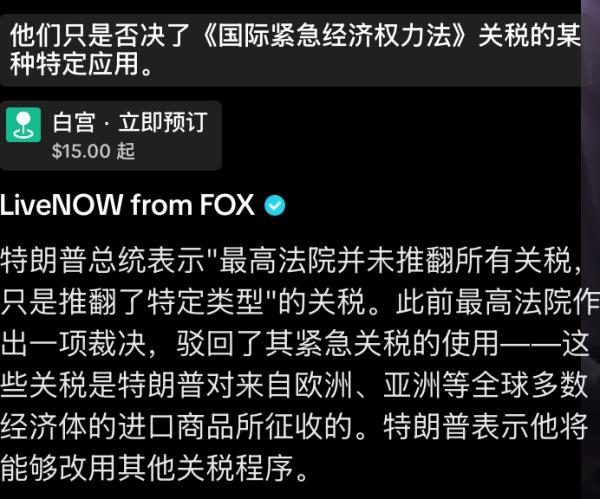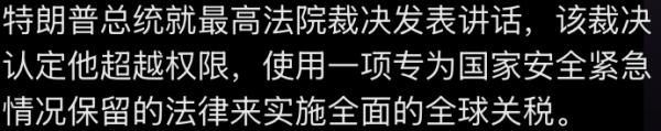 川普继续说道,该裁决“并未推翻关税本身”,而“仅仅推翻了《国际紧急经济权力法》(简称IEEPA)中关于关税的特定用途”。