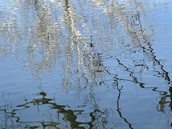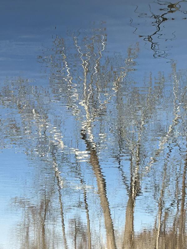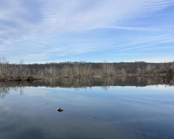 一次是去年年底去马里兰州,休息时朋友带我看大瀑布公园。我们沿着波托马克河(Potomac)畔的小土路散步,对岸长长的疏林带中,条条灰白雾霭散淡,一株株悬铃木站在宽阔水边,裸露的银白色身躯,在碧水中变形,迷蒙,无比的轻柔让我听到祂的话语,我的心里柔和谦卑……