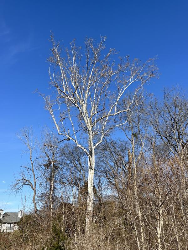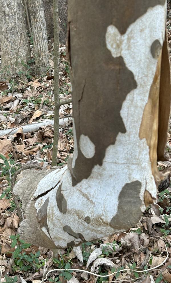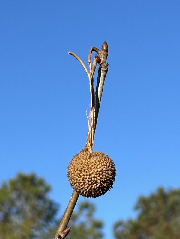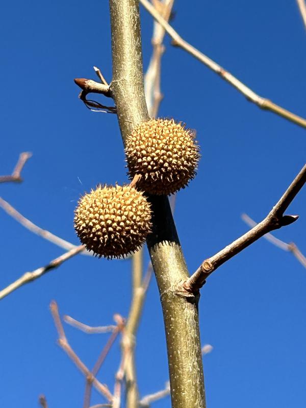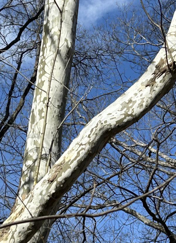 悬铃木(Platanus spp.)的高大树干尤其美妙。好玩的是它们哥仨竟以球分大小,就像农村孩子叫大宝、二宝、三宝一样,它们分别叫三球(法国梧桐)、二球(英国梧桐)、一球(美国梧桐)。生长在夏洛特小糖溪绿道附近的悬铃木,是一球。它是大哥还是小老弟,学术界无定论,我也不便多言。
