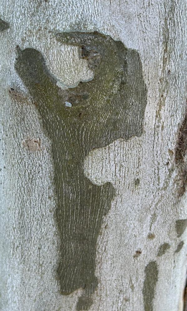 最美的是树干。树皮剥落,露出灰白、绿白、棕色的斑驳图案,有人说“斑马纹,我觉得更像远古初民的画作,刻在岩石上,棕红色的石头是小熊,绿白的是小乌龟、小狗,小猫,小兔子,一个个说悄悄话,我要跟你玩。