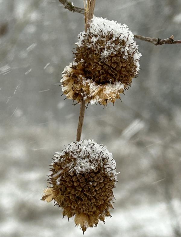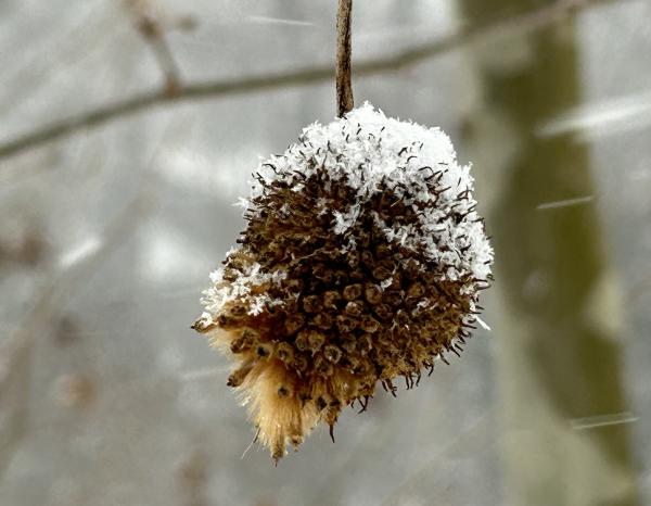 它的果实虽如小球,但个个独立,悬挂在光秃秃的枝条上,宛如风铃,等待着风儿敲响。坚果基部破裂,露出一小团绒毛,随时准备随风而去。