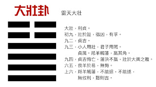 大壮卦上雷下天,由震卦和干卦组成,所谓雷天大壮。这一卦,属于十二个消息卦中的一个,对应农历二月,所谓:四阳生,惊蛰春分,阳气强盛,开始步向春天。合乎黄宗羲的判断。从爻辞上来看,大致讲的是与牧羊有关的故事,有三次提到羊。九三和上六都提到「羝羊触藩」、六五则提到「丧羊于易」。这一卦大致预测问卦的人是一个强壮的牧者,也就是领袖,视百姓为温顺绵羊,在管理上虽然大多可以顺心如意。