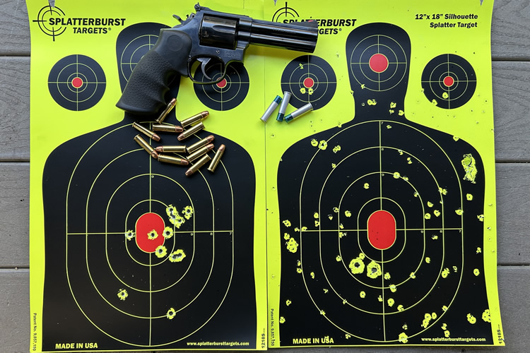 视频中两张同样的靶纸,分别在7码处用Smith & Wesson 586用3发霰弹和12发点38特子弹射击,结果如下图所示。视频中可能看得更清楚,但结论应该已经很明显。想到极端情况,在家中不太大的空间里劈头盖脸打上几枪,也许不会致命,但于劝阻对方停止作恶的说服力,效果绝对可以放心。
