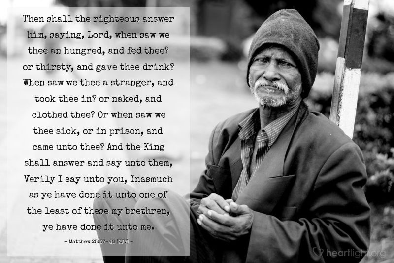 “义人就回答说:‘王啊,我们什么时候见你饿了,给你吃,渴了,给你喝?什么时候见你作客旅,留你住,或是赤身裸体,给你穿?又什么时候见你病了,或是在监里,来看你呢?’”